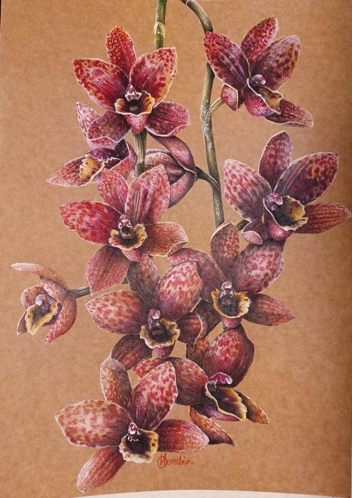 Storczyki to jedne z najbardziej fascynujących roślin świata — ich architektura, symetria i złożoność formy stanowią idealny temat dla rysunku botanicznego. W tej serii każdy egzemplarz potraktowany jest indywidualnie, niemal portretowo, z pełnym szacunkiem dla jego naturalnej struktury i charakteru.